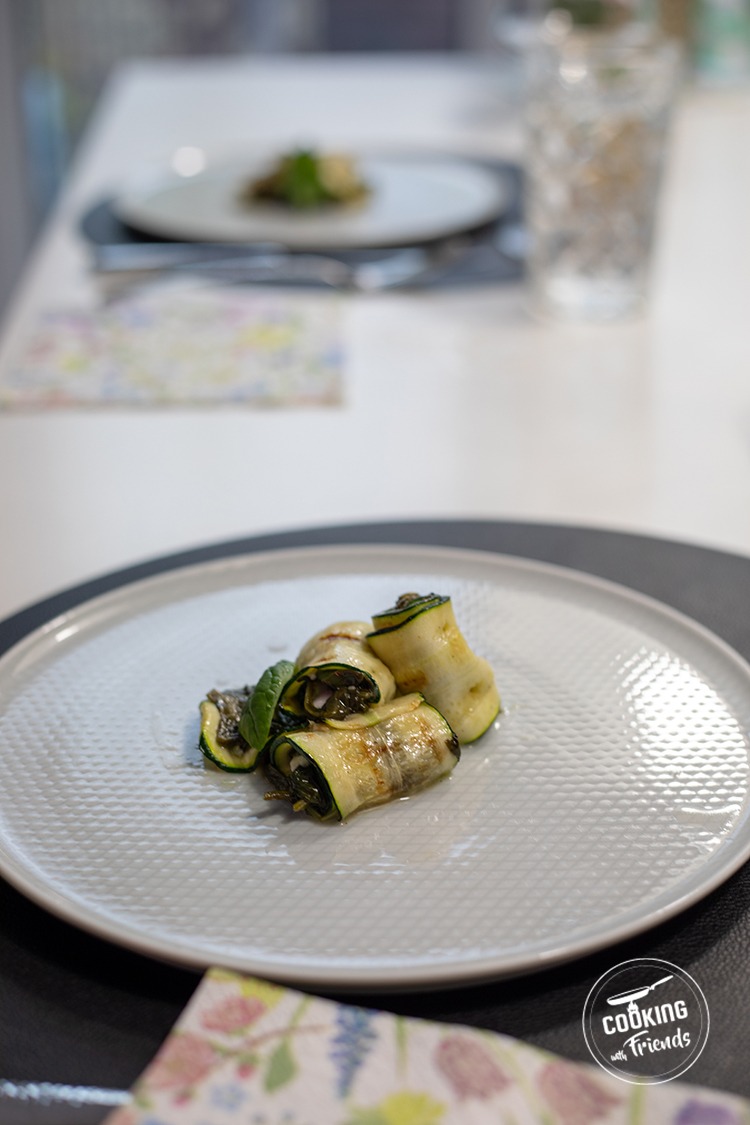 Zucchiniröllchen vom Grill mit Mozzarella und Spinat-Pesto-Sauce