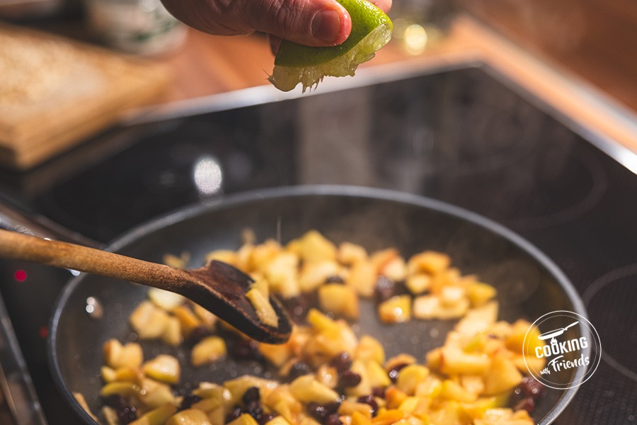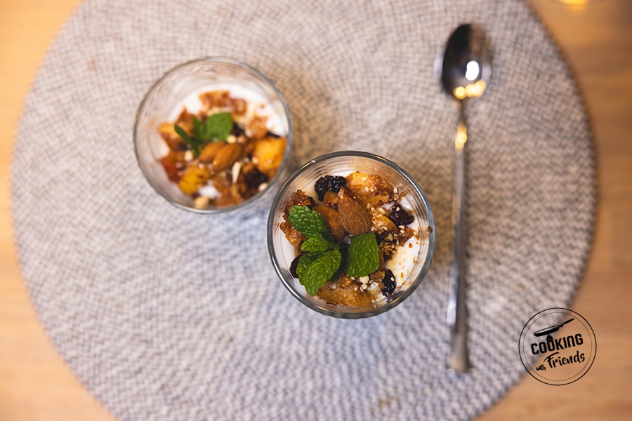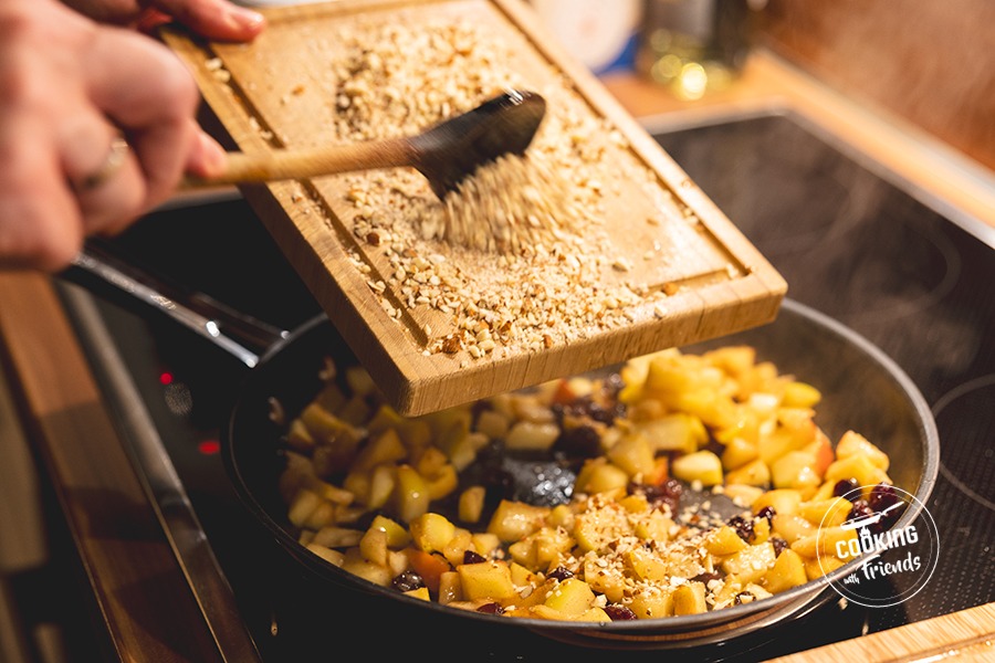 Nun die Cranberries oder Rosinen sowie die gehackte Mandeln unterrühren und kurz mit erwärmen, sodass sich die Aromen verbinden. Aufpassen, dass die Äpfel nicht zu weich werden, da sich sonst Apfelmus bildet. Grundsätzlich nicht schlimm, wir wollen jedoch etwas von den Apfelstücken im Joghurt merken.
