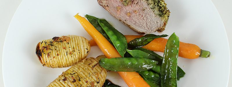 Lammrücken auf Süßkartoffelpüree mit Austernpilzen, roten Schmorzwiebeln und grünem Wildspargel