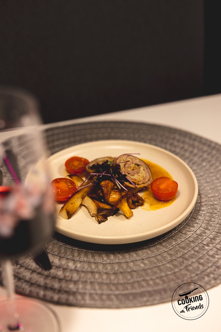 Kalbsrouladen mit Mandel-Kartoffel-Füllung und geschmorten Tomatenpilzen