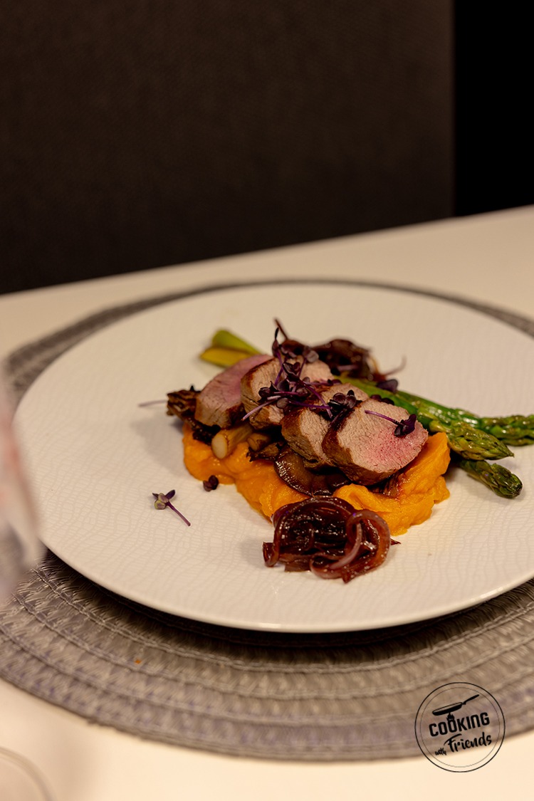 Lammrücken auf Süßkartoffelpüree mit Austernpilzen, roten Schmorzwiebeln und grünem Wildspargel
