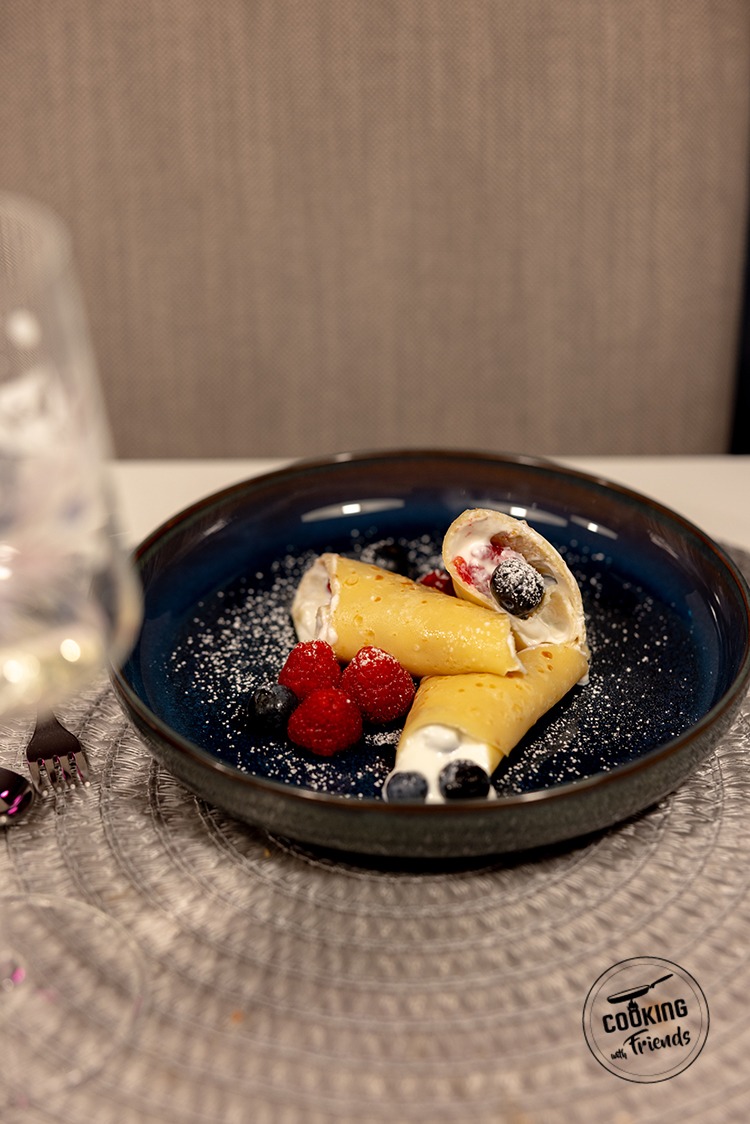 Gefüllte Crêpes mit Quark-Joghurt-Creme, Erdbeeren und Heidelbeeren
