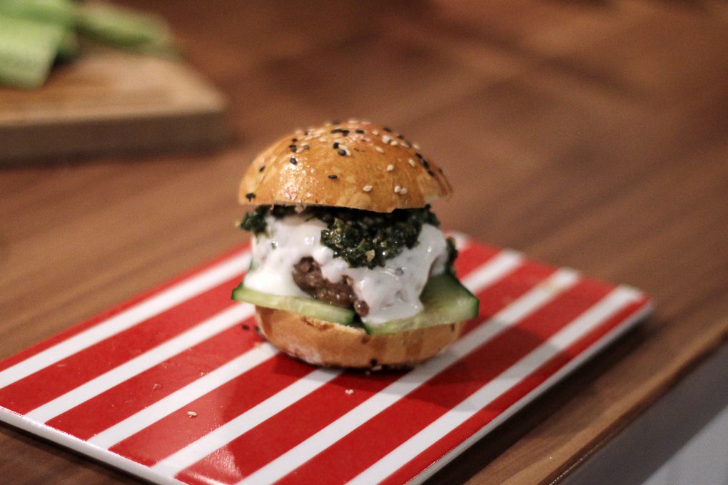 Lammburger mit Joghurt, marinierter Gurke und Minzpesto
