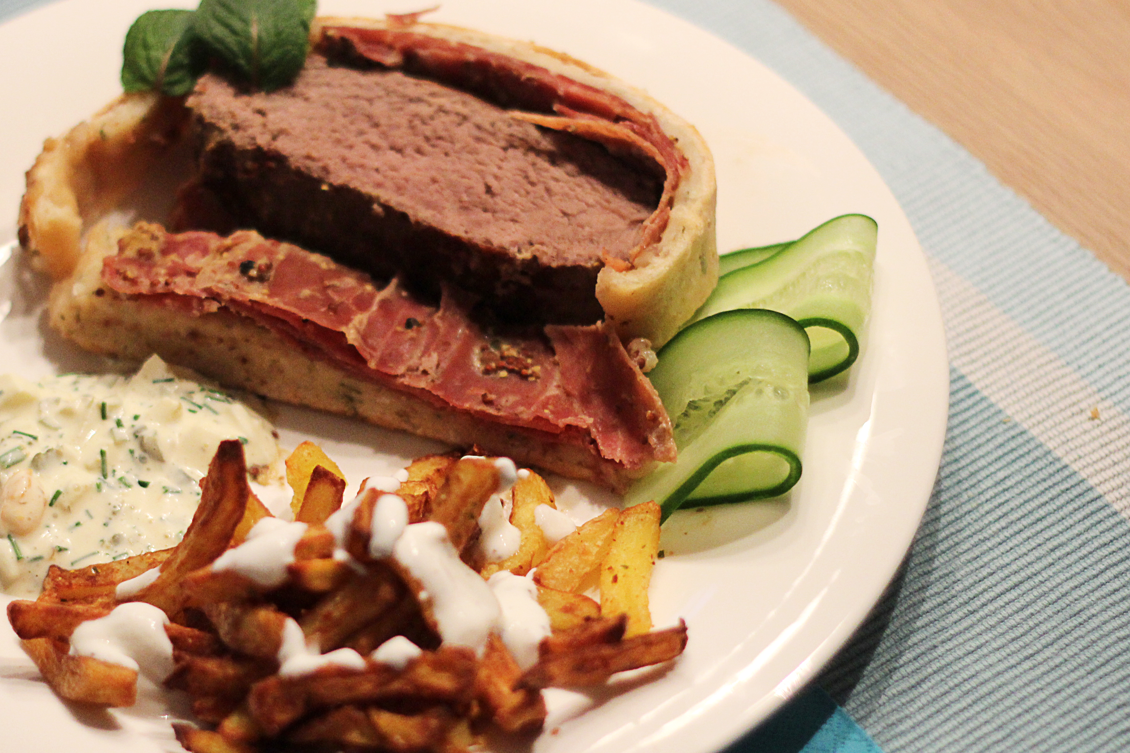 | Rezept öffnenRoastbeef in Meersalz-Thymian-Kruste mit handgemachten Pommes Frites