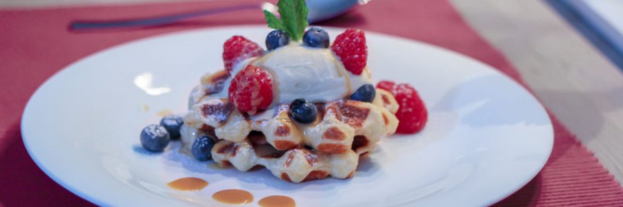 Lütticher Waffeln mit Himbeeren und Heidelbeeren auf Vanilleeis mit gesalzener Toffeé-Crème | Rezept öffnen