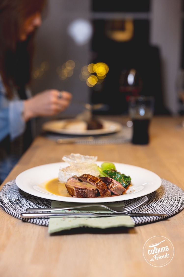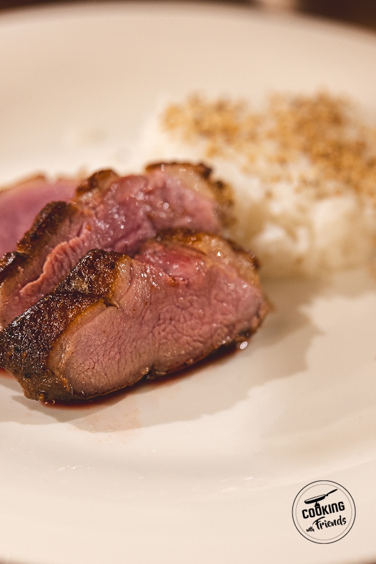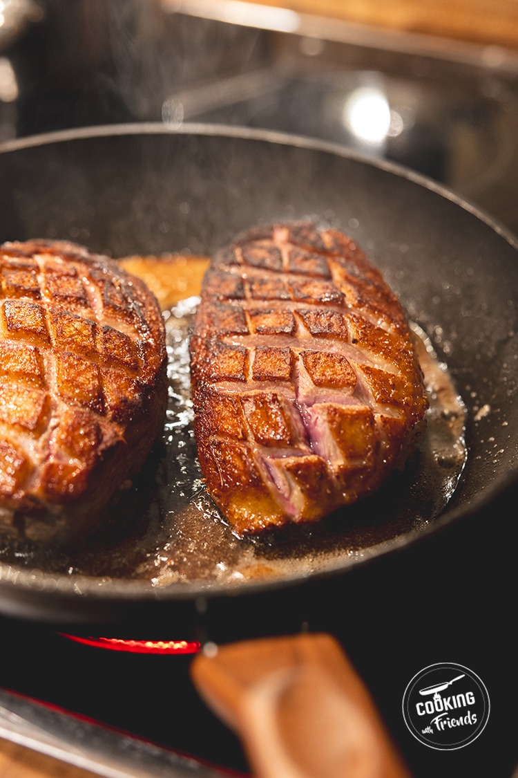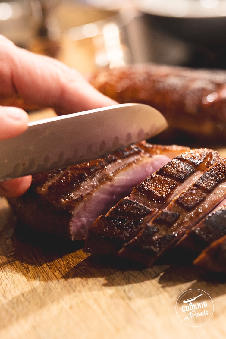 Anschließend die Pfanne in den Ofen geben und die Entenbrüste ca. 8 Minuten rosa garen. Danach 5–10 Minuten ruhen lassen. In feine Scheiben schneiden.
