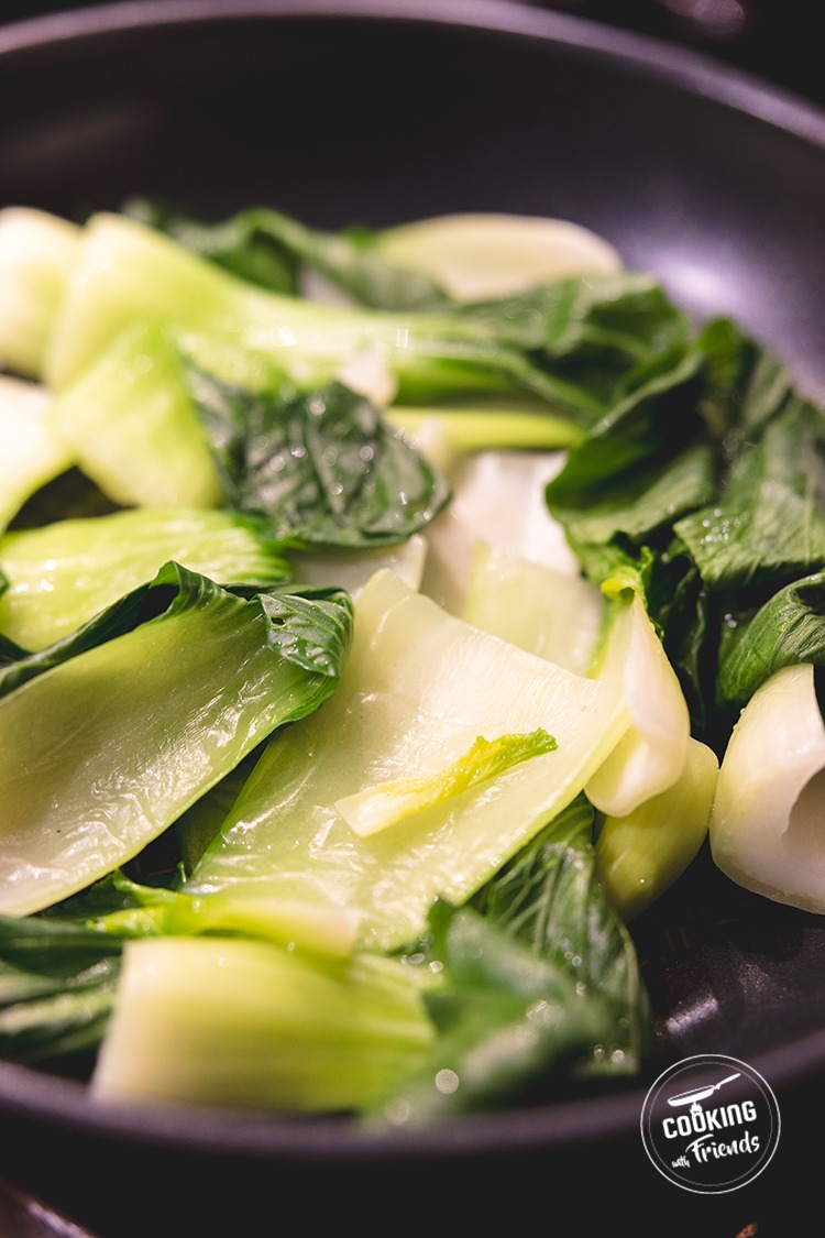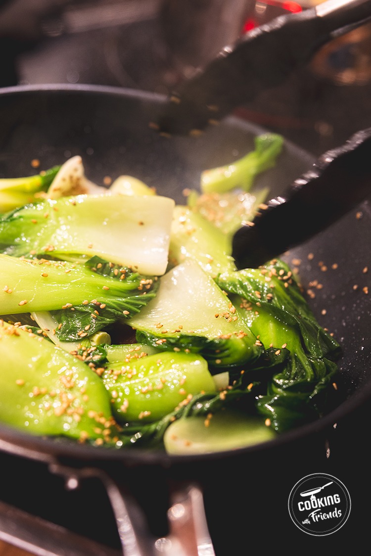 Den Pak Choi putzen und in kochendem Salzwasser 1–2 Minuten blanchieren. Abtropfen lassen und mit Sesamöl, Salz und Pfeffer würzen.