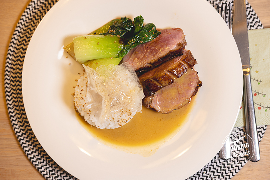 Zum Anrichten den Jasminreis auf Tellern verteilen, mit Sesam bestreuen, die Currysauce darüber geben, die Entenscheiben darauflegen und mit knusprigem Reispapier garnieren. Pak Choi dazu servieren.