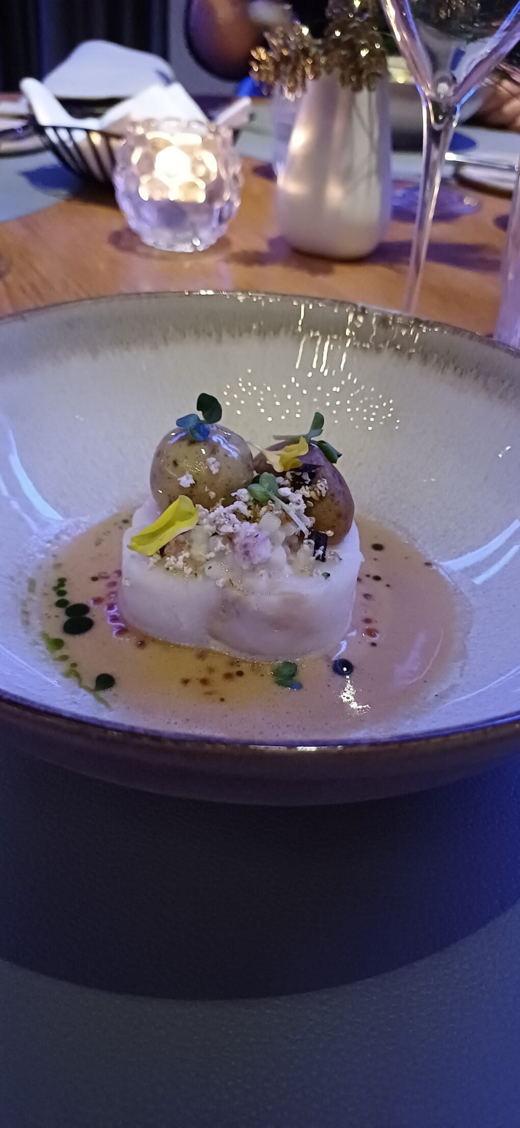 Es folgten die kunstvollen Gänge, die je nach Menü variierten, darunter Höhepunkte wie: Forelle, Yuzukoshō, Blutorange; Hummer, Kürbis, Kartoffelschaum; Short Rib vom Wagyu mit Trüffel, Topinambur; Kabeljau, Aal, Zwiebelconfit; Hirsch, Birne, Haselnuss und Entenbrust, rote Bete, Pfefferzwiebel.