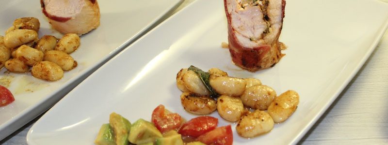 Die Rouladen nach dem Braten kurz ruhen lassen. Gnocchi im leicht gesalzenen Wasser 3 bis 4 Minuten kochen, bis sie an der Oberfläche schwimmen. Die Gnocchi mit einer Schaumkelle aus dem Topf nehmen, abtropfen lassen und in die Pfanne geben, in der zuvor die Rouladen gebraten wurden. Weitere Butter und weiteren Salbei hinzugeben und braten. Mit Salz abschmecken. Die Rouladen schräg aufschneiden und auf dem Teller anrichten, die Gnocchi dazugeben mit dem Rest der Paprika-Hirtenkäsemasse servieren.