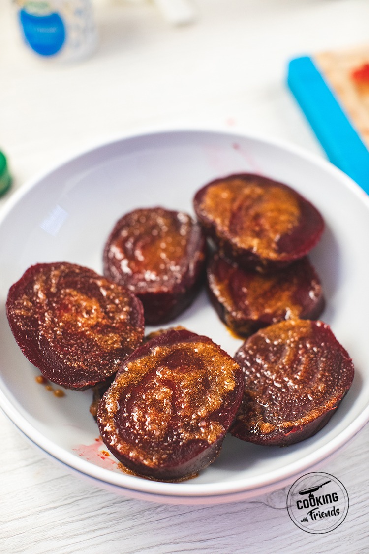 In einer Schüssel aus Olivenöl, geräuchertem Paprikapulver, Zwiebelpulver, grobem Meersalz und frisch gemahlenem schwarzem Pfeffer eine Marinade anrühren. Die Rote-Bete-Scheiben vorsichtig darin wenden, sodass sie rundum mit der Marinade bedeckt sind. Die marinierten Scheiben abgedeckt etwa 30 Minuten ziehen lassen.