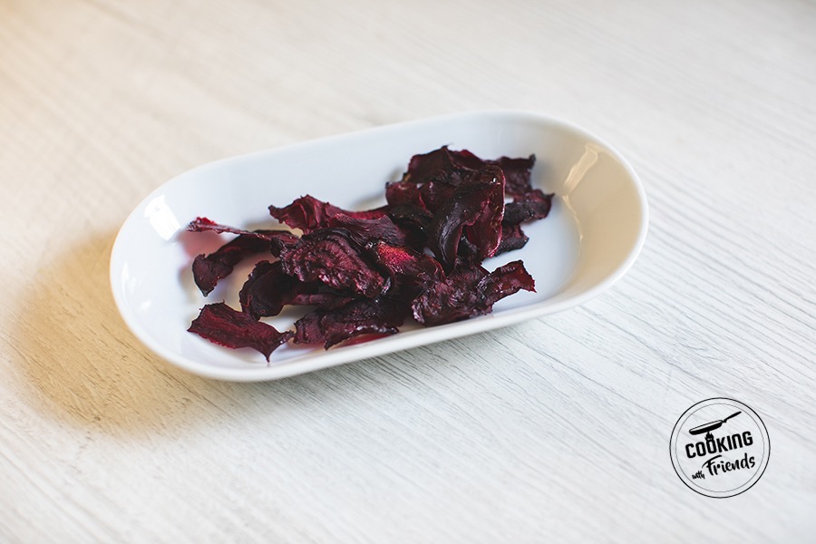 Als besonderen Chrunch haben wir ein paar Rote Bete Streifen bei 60°C in der Heißluftfritöse getrocknet und daraus dann Rote Bete Chips hergestellt, da sich besodner als zusätzliches Topping für dieses Gericht, aber natürlich auch für andere Gerichte sehr gut eignen.