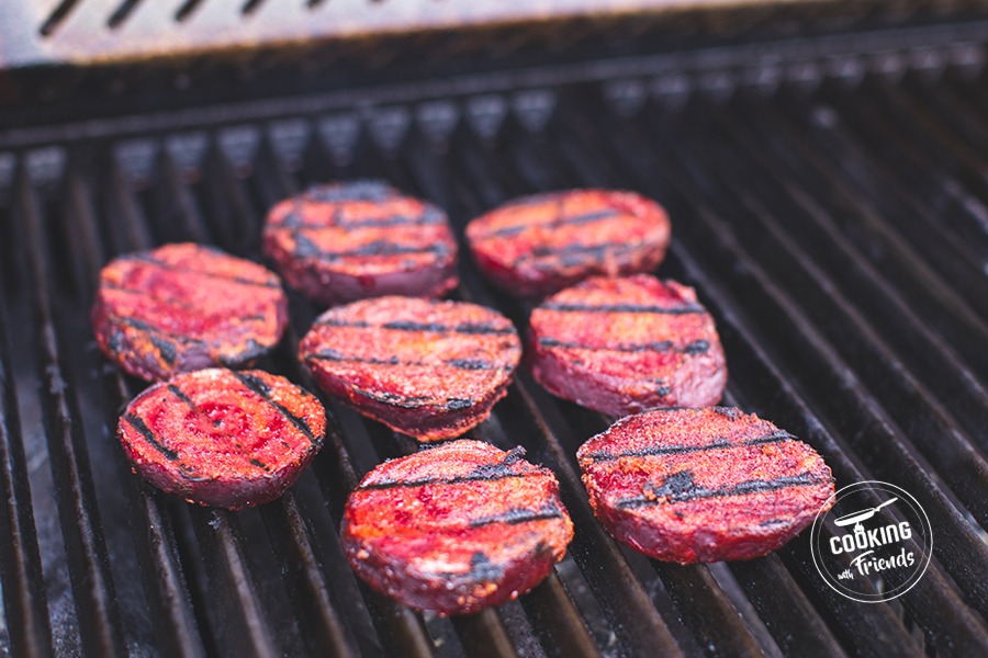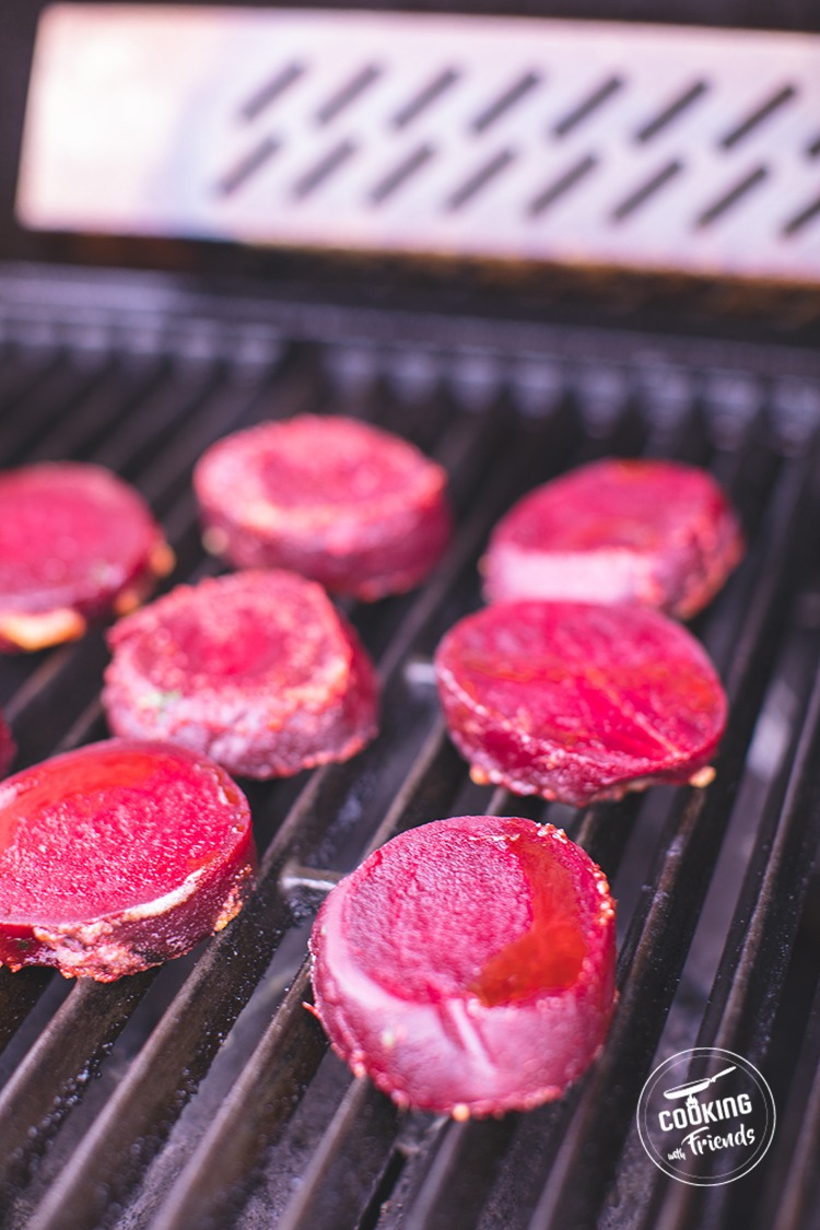 Den Gasgrill auf hohe direkte Hitze vorheizen. Die Rote-Bete-Scheiben direkt auf den heißen Grillrost legen und von beiden Seiten jeweils 2–3 Minuten scharf angrillen, bis sich deutliche Grillstreifen zeigen und ein kräftiges Röstaroma entsteht.
