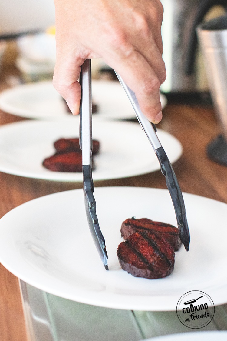 Die gegrillte Rote Bete damit toppen und das Rote Bete Steak noch warm servieren.