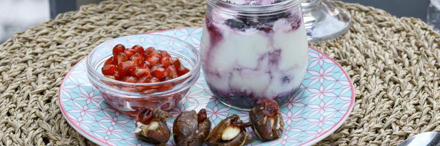 Zum Servieren die Dessertgläser auf ein kleines Tablett stellen und mit den Datteln und den Granatapfelkernen servieren.