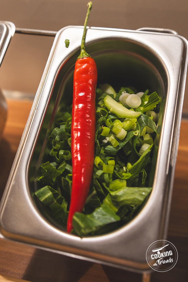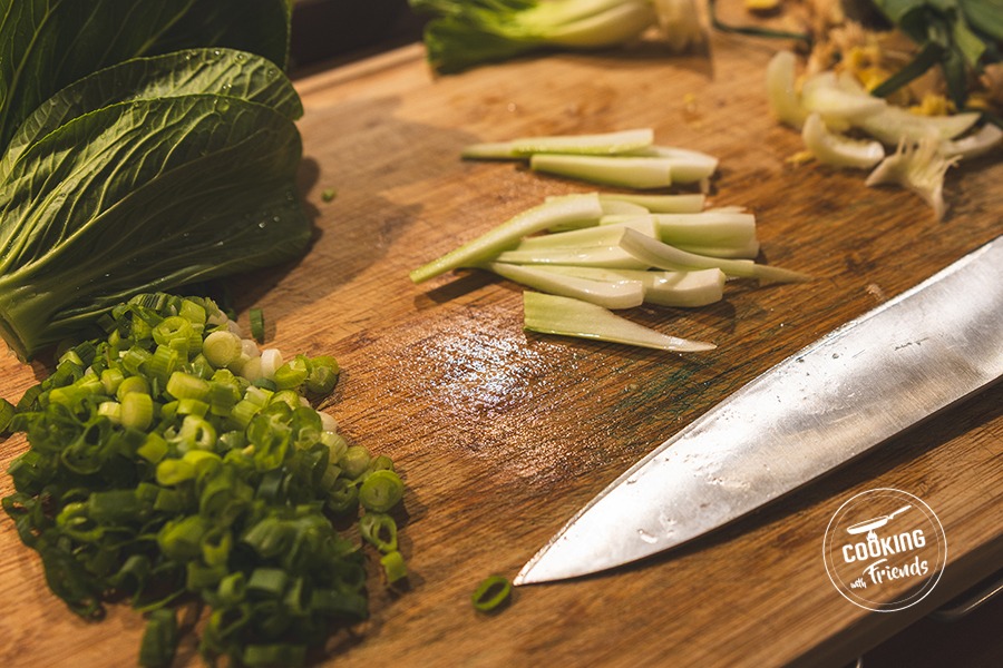 Währenddessen das Hähnchenbrustfilet von Fett und Sehnen befreien und in feine Streifen schneiden. Den Pak Choi gründlich waschen, die grünen Blätter von den harten Stielen trennen und die Stiele in mundgerechte Stücke schneiden. Die Chilischote waschen, entkernen und in dünne Ringe schneiden.