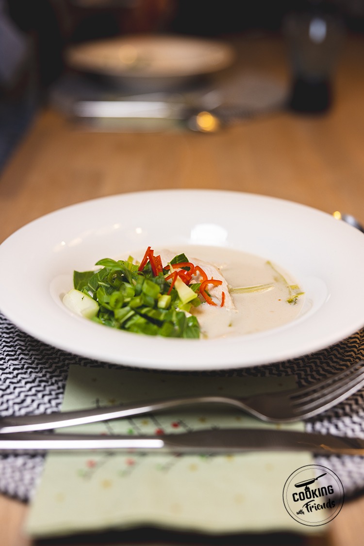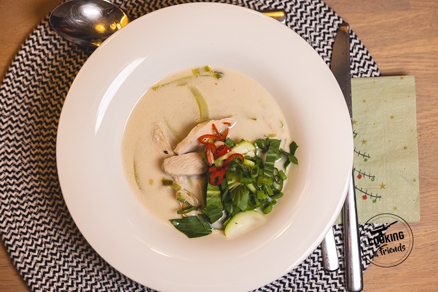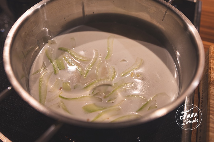 Die Hühnerbrühe zusammen mit der Kokosmilch in einen Topf geben und gut verrühren. Die Temperatur auf mittlere Hitze einstellen. Den Ingwer schälen und direkt mit einer feinen Reibe in die Suppe reiben. Die Basis etwa fünf Minuten sanft köcheln lassen, damit sich das Aroma entfaltet.