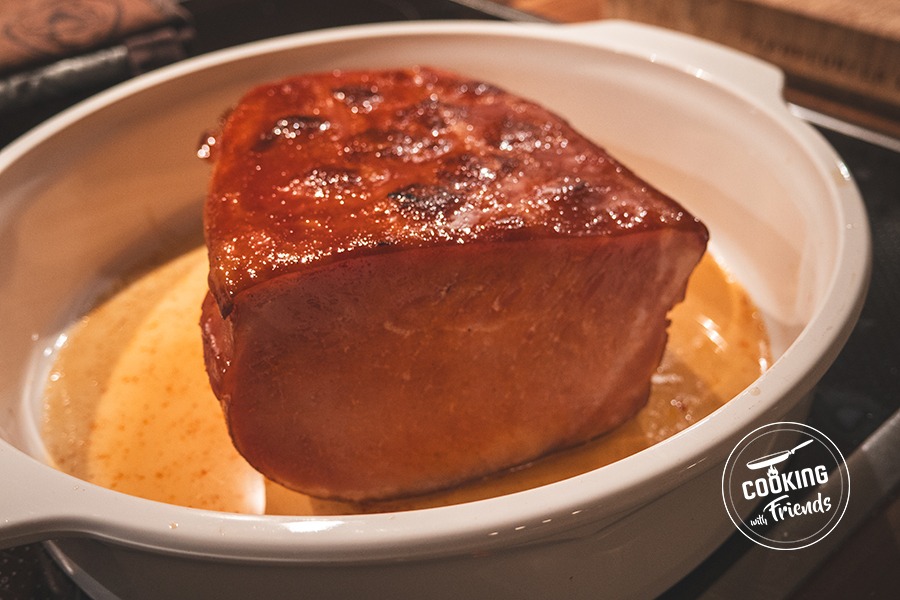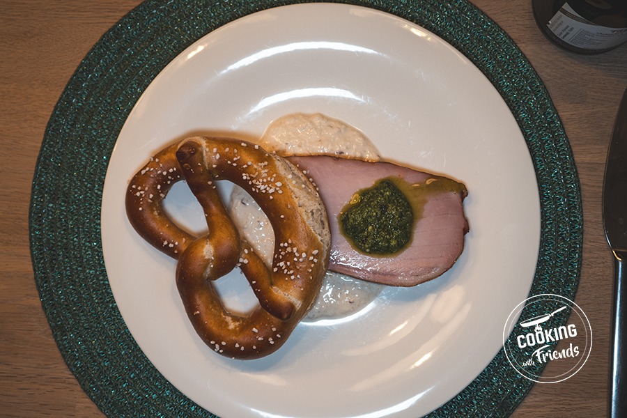 In der gehobenen Zubereitung nutzen wir hier das Niedrigtemperaturgaren. Da Kasseler durch das Pökeln bereits einen Teil seiner Zellfeuchtigkeit verloren hat, neigt es bei herkömmlichen Bratmethoden schnell zum Austrocknen. Die sanfte Hitze von 100°C bewahrt die Saftigkeit im Kern, während das spätere „Finnish“ bei 180°C mit der Honig-Cognac-Glasur für eine komplexe Süße sorgt. Der Meerrettich (auch „Antibiotikum des Gartens“ genannt) bringt mit seinen Senfölen eine flüchtige Schärfe ein, die durch das Fett der sauren Sahne und die nussige Tiefe des Cashewmus perfekt abgefedert wird. Das Kräuteröl mit Parmesan schlägt schließlich die Brücke zwischen rustikaler deutscher Tradition und moderner Finesse.
