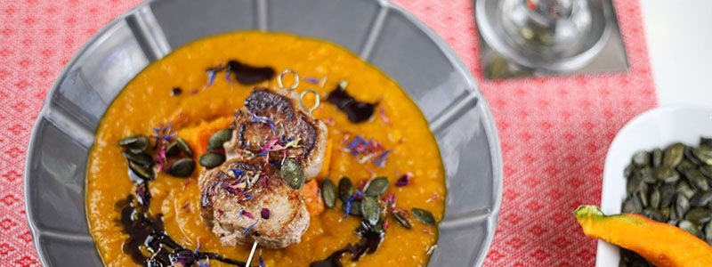 Das Schweinefilet auf die Rolladennadeln aufpiecksen und in einer Pfanne mit ein wenig Öl langsam von beiden Seiten je circa 4 Minuten anbraten. Nun noch das Schweinefilet mit Salz und Pfeffer würzen. Die Suppe in einer Schüssel oder einem tiefen Teller anrichten, den Spieß in die Mitte setzen (oder an den Rand des Tellers). Mit den gerösteten Kernen und etwas Kürbiskernöl begießen und nach Belieben mit getrockneten, essbaren Blüten (z.B. Lavendel) dekorieren.