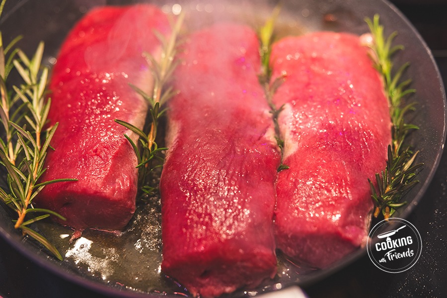 Im vorgeheizten Ofen bei 140 °C ca. 10–14 Minuten garen, bis die Kerntemperatur 56–58 °C für rosa erreicht.