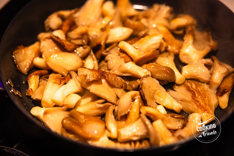 Austernpilze putzen und je nach Größe halbieren oder im Ganzen lassen.