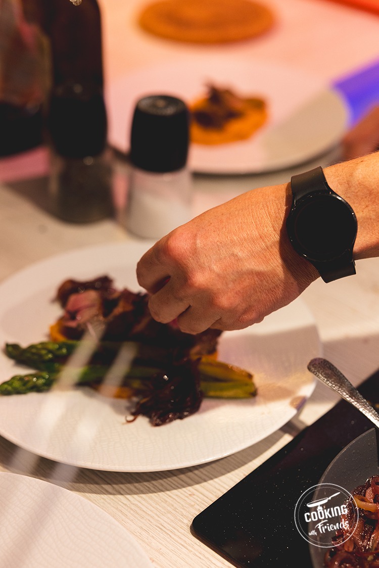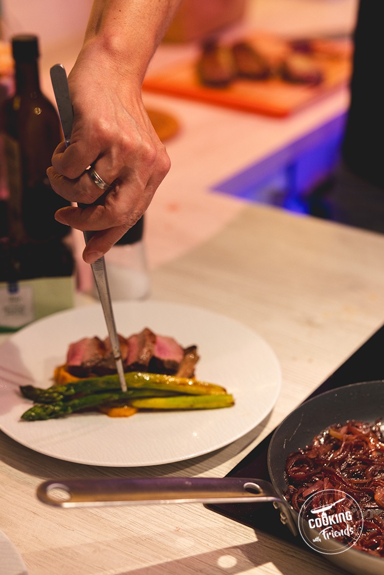 Mit roten Schmorzwiebeln und wildem Spargel ergänzen. Sofort servieren.