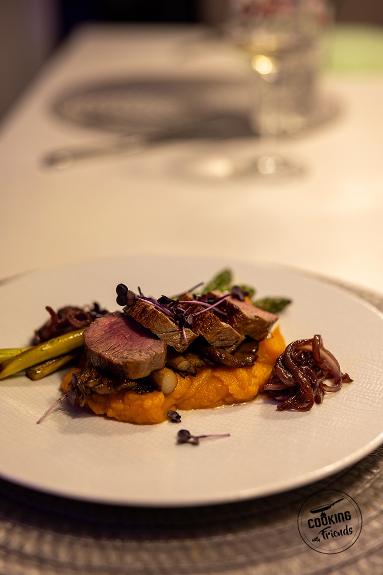 Lammrücken zählt zu den zartesten und aromatischsten Teilen des Lamms, da dieses Stück besonders fein marmoriert, aber gleichzeitig mager ist. Beim Braten bleibt es saftig, wenn es nur kurz hoher Hitze ausgesetzt und anschließend schonend gegart wird. In Kombination mit Süßkartoffel entsteht ein spannender Kontrast aus nussiger Süße und herzhaftem Fleischgeschmack. Auch Austernpilze und Spargel passen hervorragend, da sie Umami- und Grillaromen beisteuern und das Gericht in Richtung moderner, saisonaler Küche erweitern. Lammrücken ist ideal für festliche Gerichte, da er trotz geringer Garzeiten eine eindrucksvolle Wirkung auf dem Teller erzielt.