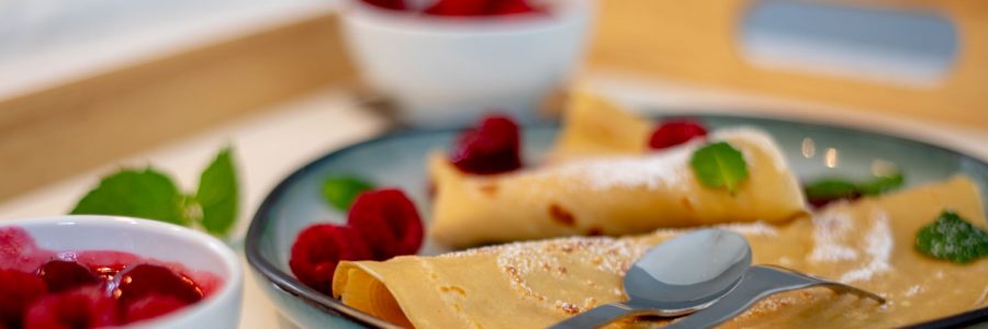 Die Crepes nun auf die Teller geben und mit den Himbeeren und der Soße dekorieren. Mit Pderzucker bestäuben und mit ein paar fricshen Minzblättchen garnieren.