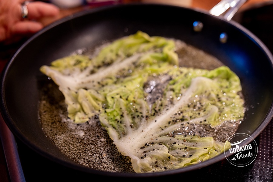 Die Spitzkohlblätter der Länge nach halbieren. In kochendem Salzwasser etwa 2–3 Minuten blanchieren, bis sie leicht weich sind, dann auf Küchenpapier abtropfen lassen. In einer großen Pfanne das Sesamöl mit 25 g Butter erhitzen und die Kohlblätter darin auf beiden Seiten goldbraun anbraten. Mit Salz, Pfeffer und einer Prise Zucker kräftig würzen. Gegen Ende der Bratzeit mit Sesamsamen bestreuen.
