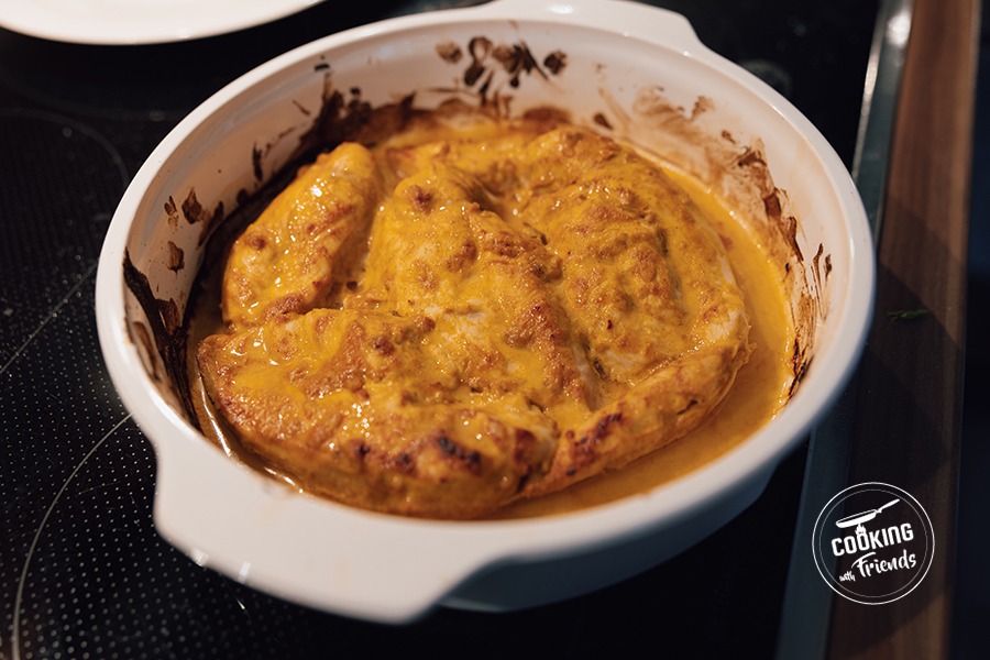 Die Hähnchenbrüste mit Küchenpapier trocken tupfen. Zwei Drittel der Marinade großzügig auf den Fleischstücken verteilen und diese vollständig damit bedecken. In eine passende ofenfeste Form legen, sodass die Stücke nebeneinander Platz haben. Den Ofen auf 130 °C Umluft vorheizen und das Fleisch in der mittleren Schiene etwa 25 Minuten garen, bis es durchgegart und saftig ist.