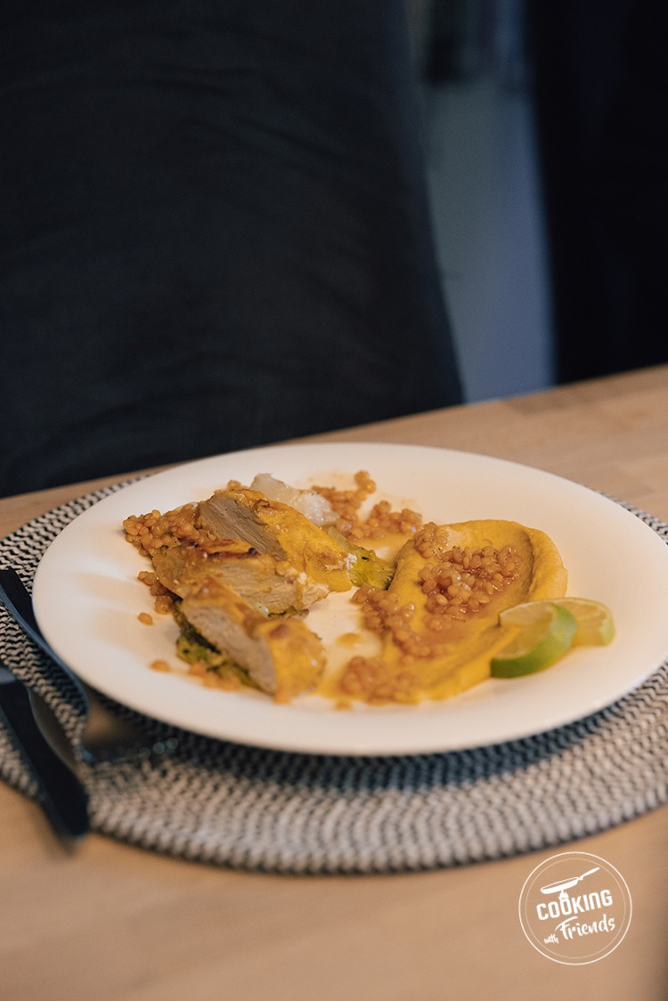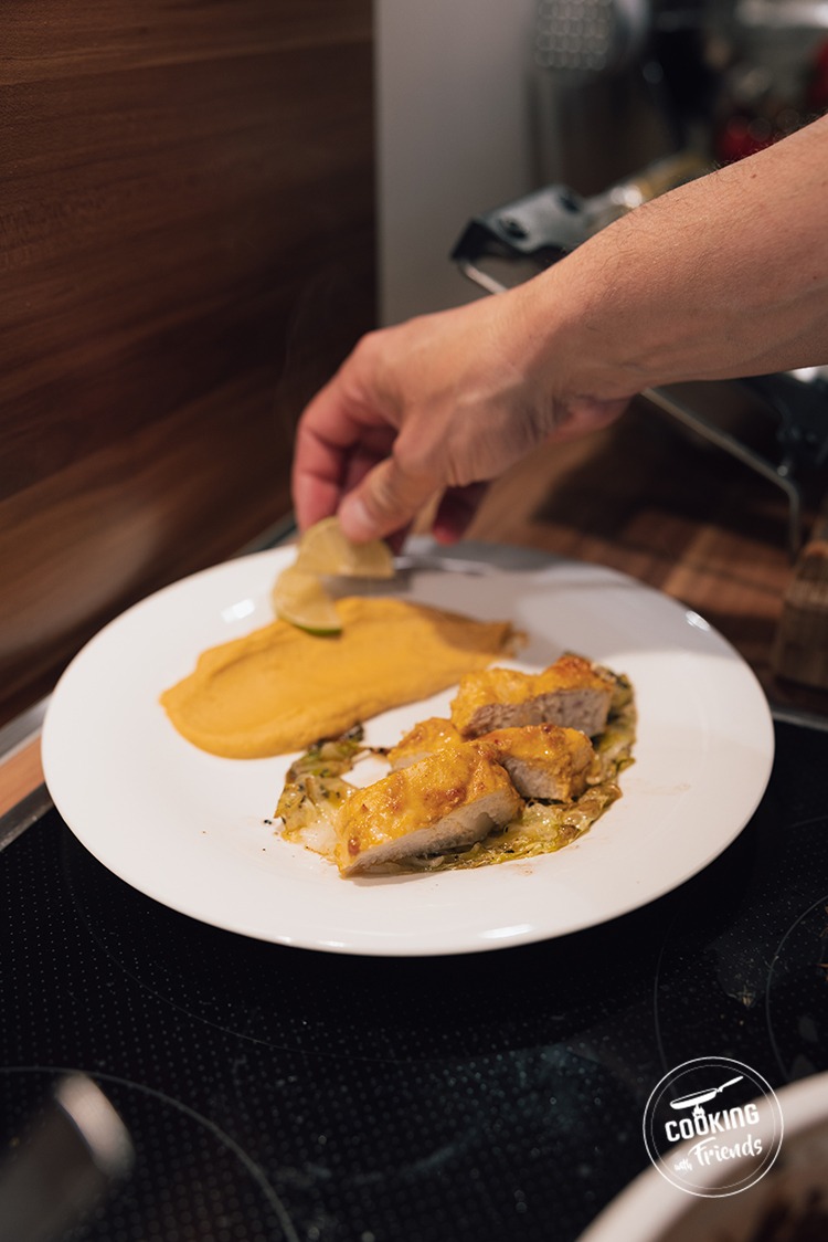 50 g Butter und die übrige Tandoori-Marinade zu den Linsen im Topf geben. Mit einem Pürierstab fein mixen, bis eine glatte Creme entsteht. Mit Salz abschmecken und warm halten.