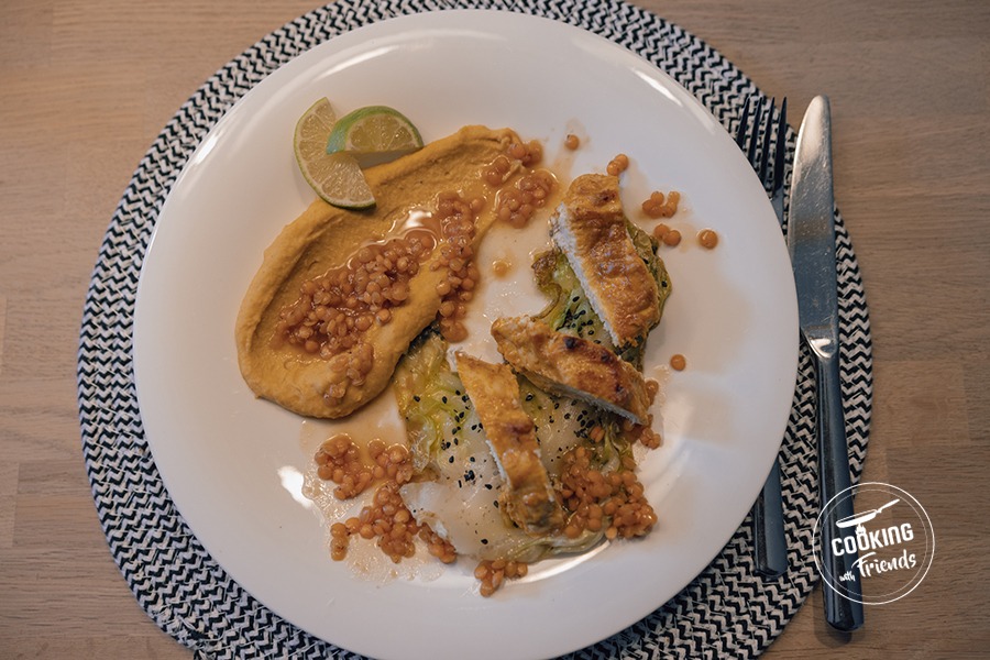 Zum Anrichten die Linsencreme mittig auf den Teller streichen, darauf die gebratenen Kohlblätter legen und die Hähnchenscheiben arrangieren. Die marinierten Linsen darüber verteilen und sofort servieren.